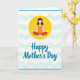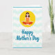 This card features a simplified woman seated cross-legged in a calm, meditative pose, her eyes closed and her hands resting open as if offering gentle care ❤️. A sunny yellow circle behind her acts like a warm halo, giving the scene a soft, affectionate glow. The background is white with smooth aqua wave shapes that drift across the page, suggesting quiet water and an easy closeness. Thin turquoise bands frame the edges, keeping the layout tidy and balanced. She wears an orange top with rust-red pants, adding cozy warmth against the cooler blues and the bright yellow. Near the bottom, the message “Happy Mother’s Day” appears in large teal lettering, centered and flowing like the waves above 🌼. The curving letter shapes echo the rolling background lines, tying the whole design together. The yellow circle sits directly behind her head and shoulders, with the aqua waves stretching horizontally across the middle of the card.