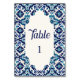 Featuring a delicate border of cobalt and turquoise tile patterns with a soft floral detail, the design frames a crisp white center space for table numbers. Perfect as escort cards, place cards, or table number displays, they add a polished and coordinated look to your reception.