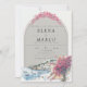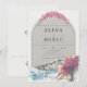 This romantic arched wedding invitation features soft watercolor artwork of a seaside village, blooming bougainvillea florals, and a refined neutral color palette—perfect for destination weddings, Italian coast celebrations, and Mediterranean-inspired ceremonies.