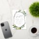 Beautiful nature theme baptism invitations for spring or summer feature gray lettering framed by a gold foil geometric border and delicate watercolor illustrations of Mediterranean greenery, leaves, olives, and lemons. Personalize with your church ceremony and celebration details. A modern choice in a natural color scheme for boho or nature themed events.