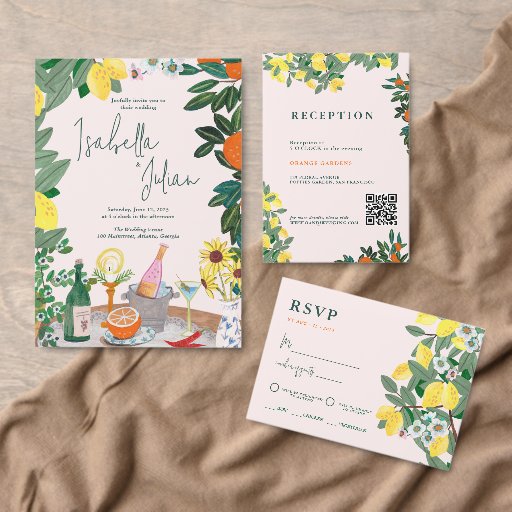 Introducing our Mediterranean-inspired wedding invitation, perfect for your upcoming spring or summer wedding. This invitation boasts an Italian sunset vibrant yellow, orange and green color scheme on a soft pink background, featuring a stunning lemon illustration that captures the essence of the Mediterranean. The design is inspired by the sunny beaches of Italy, the rolling hills of the Amalfi Coast, the charming villages of Positano, the breathtaking views of Lake Como, the picturesque landscapes of Santorini in Greece, and other romantic destinations in the Mediterranean. This invitation is a beautiful representation of the warm and inviting spirit of the Mediterranean, and is sure to set the tone for an unforgettable wedding celebration. Whether you're planning a destination wedding in one of these breathtaking locations, or simply want to bring a touch of the Mediterranean to your special day, this invitation is the perfect choice. So why wait? Order your Mediterranean-inspired wedding invitations today, and get ready to bring the beauty of the Mediterranean to your special day! Original artwork by Caroline Bonne Müller