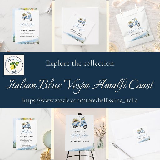 Beautiful view of Amalfi Coast in Italy, mediterranean coast, and an italian Vespa scooter. Perfect design for your bridal shower invitation.