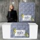 A custom Mediterranean Portuguese tiles and lemons pattern printed tapestry that can be customize to a table runner for your pop up shop. Customize the table runner with your business modern text and create your own table runner for your craft shows and vendor events. Perfect for trade shows, pop up shops, expos etc.