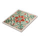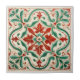 The design showcases a traditional hand-painted Mediterranean tile pattern with delicate motifs, swirls, intricate singular botanical designs in green and red colors.