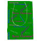 Medium glossy green Christmas gift bag with multi-color print, pink, purple, blue and gold.