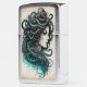 Mesmerizes with a side profile of Medusa in tranquil tones of teal and green. The lustrous scales and captivating gaze draw viewers into a contemporary mythic realm. The absence of borders allows fluidity, emphasizing the dynamic play of light on the sinuous forms. This piece encapsulates the allure and peril of Medusa in a modern palette, inviting contemplation on the interplay of beauty and danger.