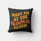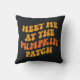This design features the phrase "Meet Me at the Pumpkin Patch" displayed in a bold, retro-inspired font with a playful, wavy appearance. The text is arranged in a staggered, diagonal layout, adding a dynamic and lively feel to the design. The color scheme includes warm autumnal hues, with the top words in a golden yellow transitioning to a rich orange towards the bottom, creating a gradient effect that enhances the festive fall theme.