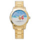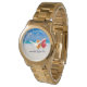 Drinks on the beach woman's watch with "Meet me in paradise" text. Imagine a romantic tryst on a tropical island whenever you check the time. Two, tropical fruity cocktails sit on smooth sand with turquoise sea water in the background. The text wraps up the side to the top. The gold band is just one of many options, so choose your favorite.