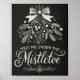 This charming holiday poster features a beautiful mistletoe illustration adorned with a bow, perfectly capturing the romantic spirit of the season. The message "Meet Me Under the Mistletoe" is elegantly displayed in hand-lettered script, making it an ideal piece of festive décor. Set against a black background, the delicate white design offers a timeless and stylish touch for any Christmas setting. This poster brings a sense of warmth and tradition, perfect for decorating your home or office during the holiday season.