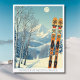 Bonjour from the snowy mountains of Megève, Haute-Savoie, France, in Europe! We hope you're having a wonderful ski vacation. This postcard features a gorgeous blue-grey mountain landscape with retro ski boards in an orange tribal pattern.