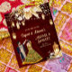 Mehndi and Sangeet maroon background with a dancing Indian bridal couple budget invitation. With gold flowers, Moroccan lanterns and fairy lights.