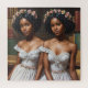 Puzzle features portrait artwork of beautiful brown-skinned twin sisters wearing floral crowns of pink flowers in their short curly hair and white dresses as they pose in the library with stacks of books behind them.