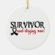 Melanoma survivors, declare your victory while delivering the important message of Melanoma awareness to everyone around you with Melanoma Survivor t-shirts, apparel, merchandise, and gifts featuring contrasting grunge and script text fonts and a distressed black Melanoma awareness ribbon arranged in a simple layout.