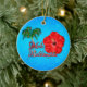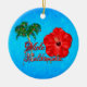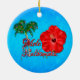 Mele Kalikimaka is Hawaiian for Merry Christmas. Celebrate a nice warm beach Christmas. Mele Kalikimaka decorated with Christmas ornaments and candy canes. A Christmas decorated palm tree and a holiday red Hibiscus flower.