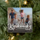 Modern hawaiian christmas holiday ornament featuring a fully printed photo for you to replace with your own, the seasons greetings "mele kalikimaka", your family name, and the year.