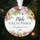Mele kalikimaka christmas tree ornament featuring a simple white background that can be changed to any color, elegant watercolor tropical flowers & palm leaves,the saying 'Mele Kalikimaka', your name, and the year.