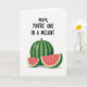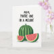 This greeting card features three stylized melon pieces across the lower half, set against a bright white background that keeps everything airy and open. In the center sits a round melon with dark and light green vertical stripes and a tiny stem, like a steady anchor in the scene. On either side, two thick triangular slices lean in close, their coral-pink flesh dotted with small dark oval seeds, giving the arrangement a cozy, affectionate closeness ❤️. The rind shifts from pale green near the fruit to deeper green at the edge, adding depth without crowding the space. Near the top, the phrase “MOM, YOU’RE ONE IN A MELON!” is written in black, slightly irregular uppercase letters, centered above the fruit. The spacing leaves plenty of white space around the words and illustration, letting the message feel direct and friendly, like a warm note shared at the kitchen table 🌼. Soft gray shadows sit just beneath the melon pieces, lightly grounding them on the white surface.