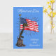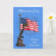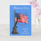 Show your patriotism on Memorial Day with a card featuring combat boots and a military rifle leaning against an American flag in front of fireworks with a message of celebrate and remember. Background is a blue with white text.