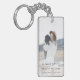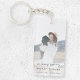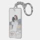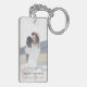 Modern, minimalist photo funeral favor keychain to celebrate the life of your loved one in a minimalist clean simple design style featuring an informal casual handwritten script font. The design can easily be personalized with your own photo and text to create a special tribute for your loved one's funeral, memorial or celebration of life. The image shown is for illustration purposes only to be replaced with your own photo. The placeholder image shows a young woman with wavy blonde hair wearing a hat and white sweater dress sitting on a gold vintage jeep in the mountains cuddling an adorable black dog. #funeral #favor #keychain #memorial