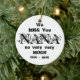 Beautiful White Porcelain Memorial Ornament In Loving Memory Of Nana Personalized. All text is customize-able on the front and the back of the Ornament. Elegant White Keepsake Memorial Ornament, with elegant decorative Black Lettering. Click image to personalize it quickly and easily. 30 Day Money Back Guarantee.