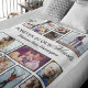 Personalized memorial fleece blanket featuring a simple white background that can be changed to any color, a 16 photo collage, the saying "forever in our hearts", and their name.