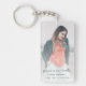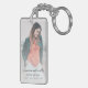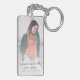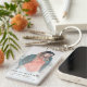 Modern, minimalist photo funeral memorial keychain to celebrate the life of your loved one in a minimalist clean simple design style featuring a handwritten script font. The design can easily be personalized with your own photo and text to create a special tribute for your loved one's funeral, memorial or celebration of life. The image shown is for illustration purposes only to be replaced with your own photo. The placeholder image shows a young woman with long wavy brown ombre hair wearing a leather jacket, orange lace top and white jeans. #memorial #keychain #favor
