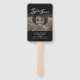 Black funeral program order of service double-sided simple in our hearts forever ceremony program fans. Simple yet elegant style program fan ideal for a summer memorial service to keep your guests cool informed and give them a keepsake of person whom they are remembering. Simply replace sample text and photo holder with your own special photo and funeral service information details. Original typography and in our hearts forever graphic design by Sarah Trett. www.sarahtrett.com for www.mylittleeden.com (Photo credit by Guilherme Stecanella on Unsplash model photo is just a placeholder image for you to replace).