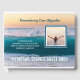 This design is meant for memorial services and other commemorative events for a dearly departed who enjoyed walking along the beach, surfing, beach combing, swimming, boating, sailing, diving, and other nautical or marine-related activities. The background image features a beautiful ocean landscape. Customize the sample text and replace the sample portrait with your own for a personalized design. Keep the background photo if you like, or replace with your favorite relevant snapshots.