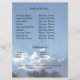 A program for a memorial service features sun rays, clouds, and blue sky as the background. A photo of the deceased loved one that has the background removed is featured in the lower right corner. "In Loving Memory" and the name of the deceased is written on the front. On the back is the Order of Services and Pallbearers. The quote, "When someone you love becomes a memory, the memory becomes a treasure," is displayed at the bottom of the backside. All text and photos are set up as templates to be personalized.