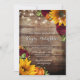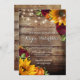 Sunflower & Roses Rustic Wood Lights Invitation featuring yellow sunflowers, red roses and baby's breath. A rustic wood background with twinkling fairy lights overhead and cursive heart design. Great for that fall country or barn wedding. Matching products available.