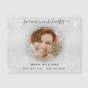 A simple and elegant memorial photo magnet. A faux silver metallic looking background, a white frame, faux glitter sparkles. Personalize and add a photo and details. Black text: forever in our hearts