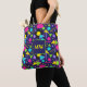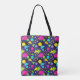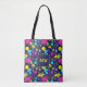 Funky memphis print dark blue tote bag with a neon geometric pattern and a monogram square on the front to add your own initials