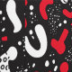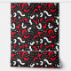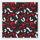A dynamic and bold seamless pattern featuring Memphis-style abstract shapes in a striking color combination of red and white against a deep black background. This contemporary design incorporates playful curved forms, dotted textures, and geometric elements reminiscent of 1980s postmodern design. Perfect for fashion accessories, modern interior decor, digital backgrounds, and trendy merchandise targeting style-conscious consumers who appreciate bold, contemporary aesthetics.