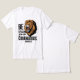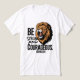 A white t-shirt with the verse "Be strong and courageous." from Joshua 1:9 in bold, capital letters near the bottom. Above the text, there is a roaring lion with a golden mane