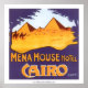 Vintage travel poster for the Mena House Hotel in Cairo, Egypt showing a desert scene of the Pyramids.