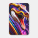 Menacing cobra snake with vibrant red blue and yellow scales showcasing its terrifyingly large fangs and a venomous glare.artificial intelligence