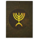 A brown and gold digital rendering of the Jewish seven-branched menorah (Hebrew: מְנוֹרָה). The seven-branched menorah, used in the portable sanctuary set up by Moses in the wilderness and later in the Temple in Jerusalem, has been a symbol of Judaism since ancient times and is the emblem on the coat of arms of the modern state of Israel. The kohanim lit the menorah in the Sanctuary every evening and cleaned it out every morning, replacing the wicks and putting fresh olive oil into the cups. It has been said that the menorah is a symbol of the nation of Israel and our mission to be "a light unto the nations." (Isaiah 42:6). Our sages emphasize that light is not a violent force; Israel is to accomplish its mission by setting an example, not by using force. This idea is highlighted in the vision in Zechariah 4:1-6. Zechariah sees a menorah, and G-d explains: "Not by might, nor by power, but by My spirit." G-d revealed the design for the menorah to Moses as follows (Exodus 25:31-40): 31 And you must make a lampstand of pure gold. Of hammered work the lampstand is to be made. Its base, its branches, its cups, its knobs and its blossoms are to proceed out from it. 32 And six branches are running out from its sides, three branches of the lampstand from its one side and three branches of the lampstand from its other side. 33 Three cups shaped like flowers of almond are on the one set of branches, with knobs and blossoms alternating, and three cups shaped like flowers of almond on the other set of branches, with knobs and blossoms alternating. This is the way it is with the six branches running out from the lampstand. 34 And on the lampstand are four cups shaped like flowers of almond, with its knobs and its blossoms alternating. 35 And the knob under two branches is out of it and the knob under the two other branches is out of it and the knob under two more branches is out of it, for the six branches running out from the lampstand. 36 Their knobs and their branches are to proceed out from it. All of it is one piece of hammered work, of pure gold. 37 And you must make seven lamps for it; and the lamps must be lit up, and they must shine upon the area in front of it. 38 And its snuffers and its fire holders are of pure gold. 39 Of a talent of pure gold he should make it with all these utensils of it. 40 And see that you make them after their pern that was shown to you in the mountain. Until 2009, the earliest preserved representation of the menorah of the Temple was depicted in a frieze on the Arch of Titus, commemorating his triumphal parade in Rome following the destruction of Jerusalem in the year 70. In 2009, however, the ruins of a synagogue with pottery dating from before the destruction of the Second Temple were dised under land in Magdala owned by the Legionaries of Christ, who had intended to construct a center for women's studies. Inside that synagogue's ruins was discovered a rectangular stone, which had on its surface, among other ornate carvings, a depiction of the seven-branched menorah differing markedly from the depiction on the Arch of Titus, probably carved by an eyewitness to the actual menorah present at the time in the Temple at Jerusalem. This menorah has arms which are polygonal, not rounded, and the base is not graduated but triangular. Representations of the seven branched artifact have been found on tombs and monuments dating from the 1st century as a frequently used symbol of Judaism and the Jewish people. Contrary to some modern designs, the ancient menorah did not contain anything resembling seven candles as they did not exist then.