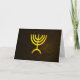 A general-purpose Jewish greeting card featuring a digital rendering of the Jewish seven-branched menorah (Hebrew: מְנוֹרָה). The seven-branched menorah, used in the portable sanctuary set up by Moses in the wilderness and later in the Temple in Jerusalem, has been a symbol of Judaism since ancient times and is the emblem on the coat of arms of the modern state of Israel. The kohanim lit the menorah in the Sanctuary every evening and cleaned it out every morning, replacing the wicks and putting fresh olive oil into the cups. It has been said that the menorah is a symbol of the nation of Israel and our mission to be "a light unto the nations." (Isaiah 42:6). Our sages emphasize that light is not a violent force; Israel is to accomplish its mission by setting an example, not by using force. This idea is highlighted in the vision in Zechariah 4:1-6. Zechariah sees a menorah, and G-d explains: "Not by might, nor by power, but by My spirit." G-d revealed the design for the menorah to Moses as follows (Exodus 25:31-40): 31 And you must make a lampstand of pure gold. Of hammered work the lampstand is to be made. Its base, its branches, its cups, its knobs and its blossoms are to proceed out from it. 32 And six branches are running out from its sides, three branches of the lampstand from its one side and three branches of the lampstand from its other side. 33 Three cups shaped like flowers of almond are on the one set of branches, with knobs and blossoms alternating, and three cups shaped like flowers of almond on the other set of branches, with knobs and blossoms alternating. This is the way it is with the six branches running out from the lampstand. 34 And on the lampstand are four cups shaped like flowers of almond, with its knobs and its blossoms alternating. 35 And the knob under two branches is out of it and the knob under the two other branches is out of it and the knob under two more branches is out of it, for the six branches running out from the lampstand. 36 Their knobs and their branches are to proceed out from it. All of it is one piece of hammered work, of pure gold. 37 And you must make seven lamps for it; and the lamps must be lit up, and they must shine upon the area in front of it. 38 And its snuffers and its fire holders are of pure gold. 39 Of a talent of pure gold he should make it with all these utensils of it. 40 And see that you make them after their pattern that was shown to you in the mountain. Until 2009, the earliest preserved representation of the menorah of the Temple was depicted in a frieze on the Arch of Titus, commemorating his triumphal parade in Rome following the destruction of Jerusalem in the year 70. In 2009, however, the ruins of a synagogue with pottery dating from before the destruction of the Second Temple were discovered under land in Magdala owned by the Legionaries of Christ, who had intended to construct a center for women's studies. Inside that synagogue's ruins was discovered a rectangular stone, which had on its surface, among other ornate carvings, a depiction of the seven-branched menorah differing markedly from the depiction on the Arch of Titus, probably carved by an eyewitness to the actual menorah present at the time in the Temple at Jerusalem. This menorah has arms which are polygonal, not rounded, and the base is not graduated but triangular. Representations of the seven branched artifact have been found on tombs and monuments dating from the 1st century as a frequently used symbol of Judaism and the Jewish people. Contrary to some modern designs, the ancient menorah did not contain anything resembling seven candles as they did not exist then.