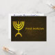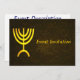 This invitation can be used for most any occasion; a Purim party, Passover seder, or a Bar or Bat Mitzvah. A digital rendering of the Jewish seven-branched menorah (Hebrew: מְנוֹרָה). The seven-branched menorah, used in the portable sanctuary set up by Moses in the wilderness and later in the Temple in Jerusalem, has been a symbol of Judaism since ancient times and is the emblem on the coat of arms of the modern state of Israel. The kohanim lit the menorah in the Sanctuary every evening and cleaned it out every morning, replacing the wicks and putting fresh olive oil into the cups. It has been said that the menorah is a symbol of the nation of Israel and our mission to be "a light unto the nations." (Isaiah 42:6). Our sages emphasize that light is not a violent force; Israel is to accomplish its mission by setting an example, not by using force. This idea is highlighted in the vision in Zechariah 4:1-6. Zechariah sees a menorah, and G-d explains: "Not by might, nor by power, but by My spirit." G-d revealed the design for the menorah to Moses as follows (Exodus 25:31-40): 31 And you must make a lampstand of pure gold. Of hammered work the lampstand is to be made. Its base, its branches, its cups, its knobs and its blossoms are to proceed out from it. 32 And six branches are running out from its sides, three branches of the lampstand from its one side and three branches of the lampstand from its other side. 33 Three cups shaped like flowers of almond are on the one set of branches, with knobs and blossoms alternating, and three cups shaped like flowers of almond on the other set of branches, with knobs and blossoms alternating. This is the way it is with the six branches running out from the lampstand. 34 And on the lampstand are four cups shaped like flowers of almond, with its knobs and its blossoms alternating. 35 And the knob under two branches is out of it and the knob under the two other branches is out of it and the knob under two more branches is out of it, for the six branches running out from the lampstand. 36 Their knobs and their branches are to proceed out from it. All of it is one piece of hammered work, of pure gold. 37 And you must make seven lamps for it; and the lamps must be lit up, and they must shine upon the area in front of it. 38 And its snuffers and its fire holders are of pure gold. 39 Of a talent of pure gold he should make it with all these utensils of it. 40 And see that you make them after their pattern that was shown to you in the mountain. Until 2009, the earliest preserved representation of the menorah of the Temple was depicted in a frieze on the Arch of Titus, commemorating his triumphal parade in Rome following the destruction of Jerusalem in the year 70. In 2009, however, the ruins of a synagogue with pottery dating from before the destruction of the Second Temple were discovered under land in Magdala owned by the Legionaries of Christ, who had intended to construct a center for women's studies. Inside that synagogue's ruins was discovered a rectangular stone, which had on its surface, among other ornate carvings, a depiction of the seven-branched menorah differing markedly from the depiction on the Arch of Titus, probably carved by an eyewitness to the actual menorah present at the time in the Temple at Jerusalem. This menorah has arms which are polygonal, not rounded, and the base is not graduated but triangular. Representations of the seven branched artifact have been found on tombs and monuments dating from the 1st century as a frequently used symbol of Judaism and the Jewish people. Contrary to some modern designs, the ancient menorah did not contain anything resembling seven candles as they did not exist then.