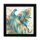 This striking jewelry keepsake box is shown in black color box with dual large sized artful peacock feather with an equally artful peacock perched between. Petite golden stars grace the background over white. In multi colors of Teals and Gold tones. Images printed on top of box.