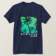 Men's t-shirt is shown in navy blue with a Hawaiian tropical palms print.