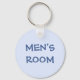 Men's room keychain with a dark blue text on a blue background. Matching ladies' restroom keychain is available.