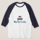 Shown on a raglan sleeve baseball style shirt and in Navy Blue and White. Small sized graphic of the American Flag with text of "GOD, help this country".