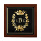 This jewelry keepsake box is shown in oak with a sleek black background and a royal looking emblem of a golden-color wreath and crown in center surrounded by a slim border in coordinating color, shown in gold-tone and all are printed on top. Pre-formatted text to for you to personalize your monograms. Sample text shown.