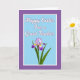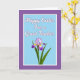 This design shows a single, striking iris filling the lower part of the card, with deep purple petals and small golden-yellow touches near the center, like a gentle spark between close friends 🌷. Slim green leaves rise upward and lean slightly, adding a calm, supportive feel against a wide light-blue background that resembles a clear spring sky. Above the flower, a short greeting sits centered near the top in decorative lettering, colored rich purple with a thin white outline for contrast. The wording is arranged in two lines, leaving airy space between the text and the flower so the layout feels open and easy to read. A thin white line frames the light-blue area, and beyond it a wider deep-purple border wraps around the whole design, tying the colors together. Bright, even lighting makes the petals look softly textured and the background look smooth, while a small 🐇 emoji can sit neatly near the message without crowding it. The iris’s yellow center sits just above the bottom edge, with the purple border forming a strong frame all the way around.