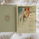 This elegant Art Nouveau wedding dinner menu draws inspiration from the iconic style of Alphonse Mucha. Featuring a graceful woman adorned with florals and intricate patterns, this menu radiates vintage charm with soft tones of beige, gold, sage green, and peach. The detailed illustration on the front is beautifully complemented by a minimalist design on the reverse, making this menu a perfect choice for couples who appreciate classical art and timeless elegance. Ideal for a vintage-themed or art-inspired wedding, this menu will add a touch of refinement to your special event.