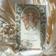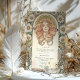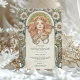 This elegant Art Nouveau wedding dinner menu draws inspiration from the iconic style of Alphonse Mucha. Featuring a graceful woman adorned with florals and intricate patterns, this menu radiates vintage charm with soft tones of beige, gold, sage green, and peach. The detailed illustration on the front is beautifully complemented by a minimalist design on the reverse, making this menu a perfect choice for couples who appreciate classical art and timeless elegance. Ideal for a vintage-themed or art-inspired wedding, this menu will add a touch of refinement to your special event.