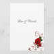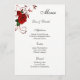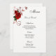 This Menu Card template is shown on basic paper in white with a lovely red rose print design. Script and standard text in black.