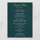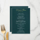 Wedding menu printed on a rich dark green background with gold and white fonts.