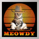 Meowdy! This funny pun design combines meow and howdy, and is a great cat lover gift for men, women, teens & kids who also love cowboy & cowgirl culture. Perfect for anyone who loves western accessories, country music and cats! If you love cats and cowboys, this vintage design is for you! Features a graphic of a tabby cat wearing a cowboy hat, set against a retro sunset.